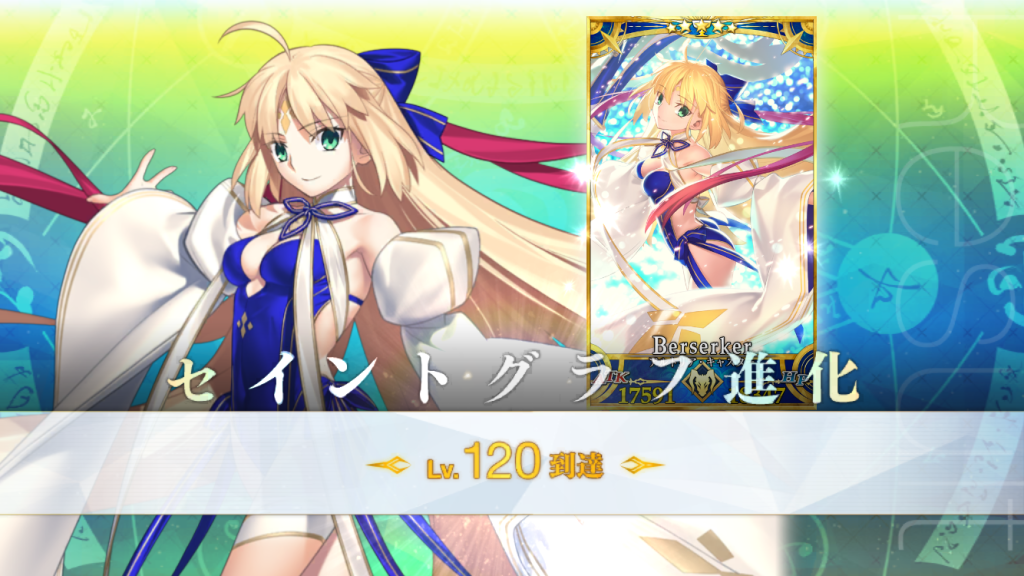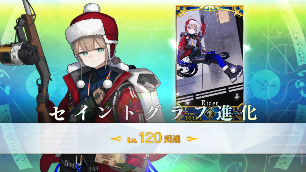 種火半額や大成功2倍などが来ていたのと、モルガンとバサキャスを宝具4まで重ねられたので、サンタネモちゃん(巡礼入り感謝~!)と3人、120にしました。